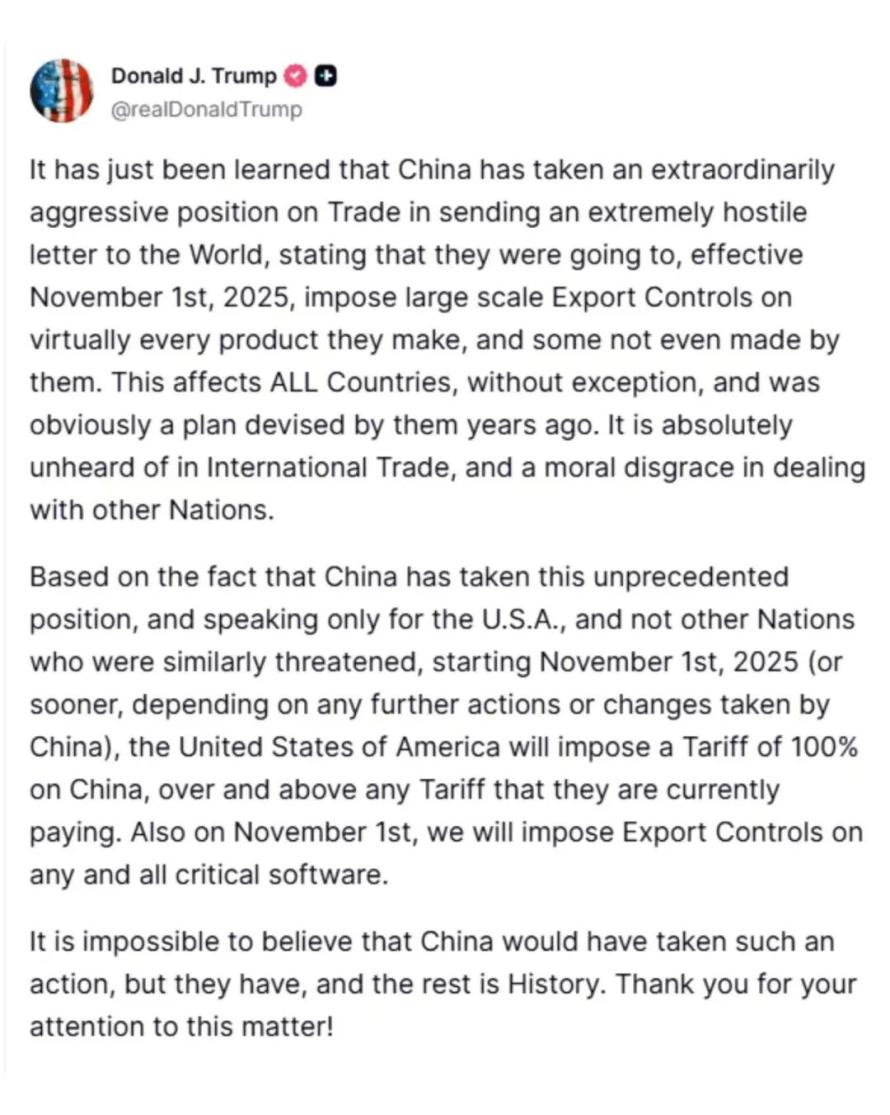 特朗普补充说:“基于中国采取了这种前所未有的立场,我仅代表美国,而非其他同样受到威胁的国家宣布,自2025年11月1日起(或更早,视中国是否采取进一步行动或改变而定),美国将对中国加征100%的关税,这是额外于他们目前已支付的税率之上。”他并表示:“同样在11月1日,我们将对所有关键软件实施出口管制。”