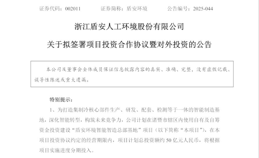 近日,全球制冷空调零部件龙头浙江盾安人工环境股份有限公司(证券代码:002011,证券简称:盾安环境)披露重大投资计划 —— 拟斥资约 50 亿元人民币,在浙江省诸暨市辖区内建设 “盾安环境智能智造总部基地”,此举旨在打造制冷核心部件全链条智能制造基地,深化企业智能转型,构筑长期竞争力。