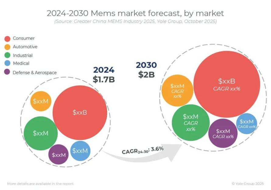 据Yole Group的最新报告,2024年中国MEMS产业营收达17亿美元,较2023年增长8.4%,占全球MEMS市场的10%;出货量达54亿片。Yole预测,2025年产业将恢复至COVID前的增长水平,2024-2030年期间将实现3.6%的复合年增长率,到2030年出货量将达66亿件,收入规模突破20亿美元。这一增长得益于各终端市场宏观趋势推动的需求增长、行业生态系统的完善以及资本与政策的支持。