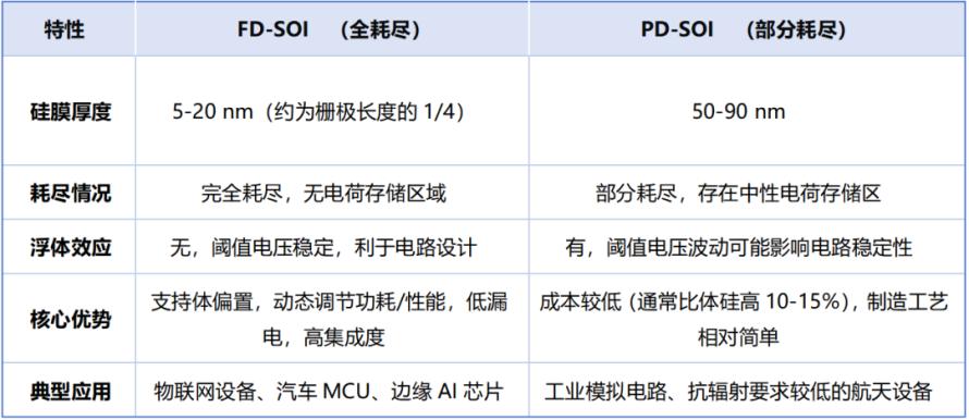 FD-SOI(全耗尽SOI)专注于低功耗数字应用,通过极薄的硅膜实现完全耗尽,支持动态功耗调节;