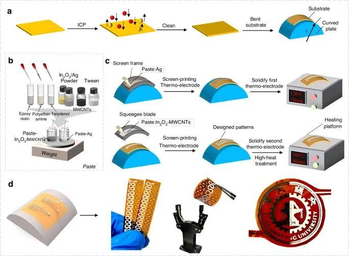 柔性聚酰亚胺基材的粗糙度改进工艺。b 丝网印刷过程中的浆料制备。c 通过丝网印刷技术制备传感器的过程。d 柔性薄膜温度传感器,采用Penao结构和定制大学标志图案