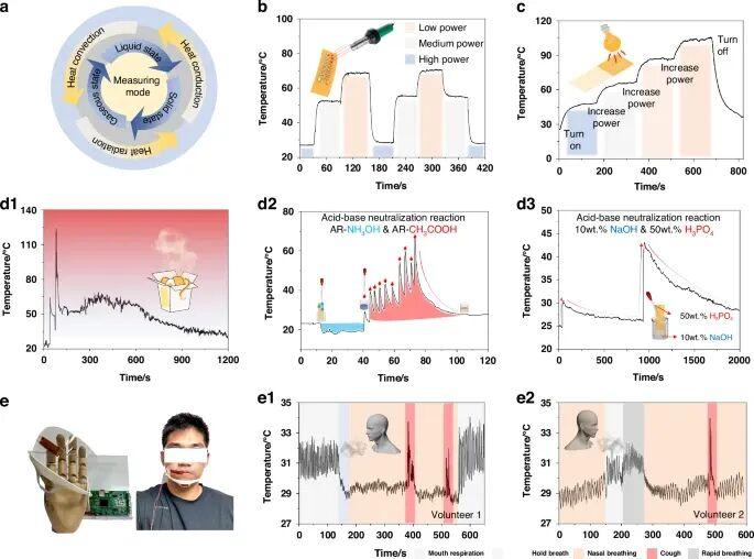 a 测量方式不同:固态、气态、液态;热传导、热对流、热辐射。b 气态-热对流:热风焊机气流温度检测。c 热辐射:基于热辐射的电加热器温度检测。d 液态-热传导:d1自热饭盒的加热包温度检测。d2, d3监测酸碱中和反应温度的实时变化。e 智能面罩,一种用于人体呼吸状态监测的可穿戴设备。e1, e2气态-热对流:针对不同佩戴者的多模式呼吸状态检测和区分