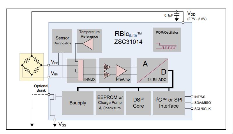 ZSC31014数字输出传感器信号调节器支持2.7V~5.5V的宽电压供电范围,电流消耗低至70uA(取决于编程采样速率),低功耗睡眠模式下电流消耗低于2uA,精度可高达±0.1%FSO (-25至+ 85°C),用作二阶充电平衡模数转换器时,在采样率超过2kHz时可提供低噪声的14位精度数据输出。芯片内置温度补偿,可用于用于传感器校正和校正温度输出,且内置传感器偏移、灵敏度、温度漂移和非线性的数字补偿,集成片上诊断功能增加了应用的安全性(如EEPROM签名、桥接连接检查、桥接短路检测),使得该型器件应用较为简单快捷。