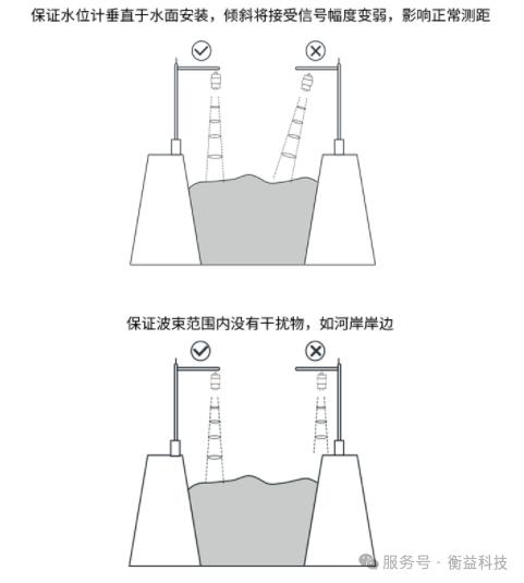 优选安装位置:必须保证仪表垂直于水面。安装点应尽量选择在水流平稳、水面波动小、远离漩涡和泄洪口的位置。同时,务必保证雷达波束范围内(水平25° x 垂直15°)没有固定的干扰物,如桥墩、护岸栏杆等,防止产生虚假回波。
