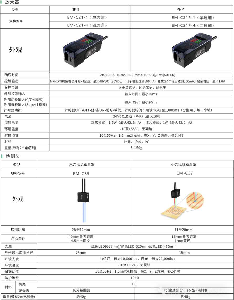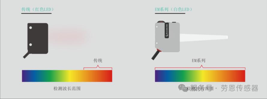传统红色LED光电传感器只能检测光的强度差异,只能接收红色波长范围的光。EM系列采用白色LED光源,具备全光谱分析能力,可接收可见光的所有波长范围,可以根据检测物的外观颜色进行检测,从而可以精准检测细微的颜色差异。