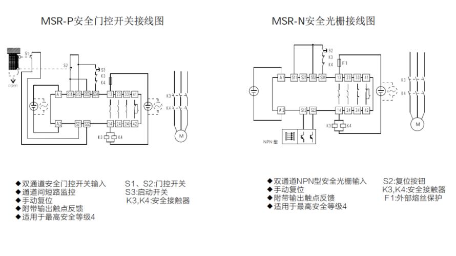 摩特智能安全继电器MSR-P与MSR-N是具有3路常开(NO)安全输出触点和1路常闭(NC)辅助输出触点的用于安全光栅上的安全继电器。它支持单、双通道操作,手动或者自动复位,并具有内置检测故障的自诊断功能。