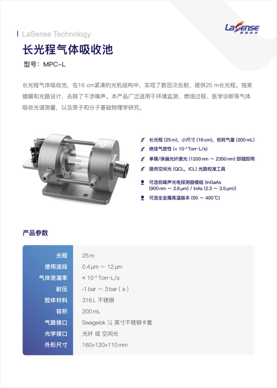 长光程气体吸收池MPC-L:光纤即插即用无需光路调节,增强气体分子的吸收信号,提升检测灵敏度。