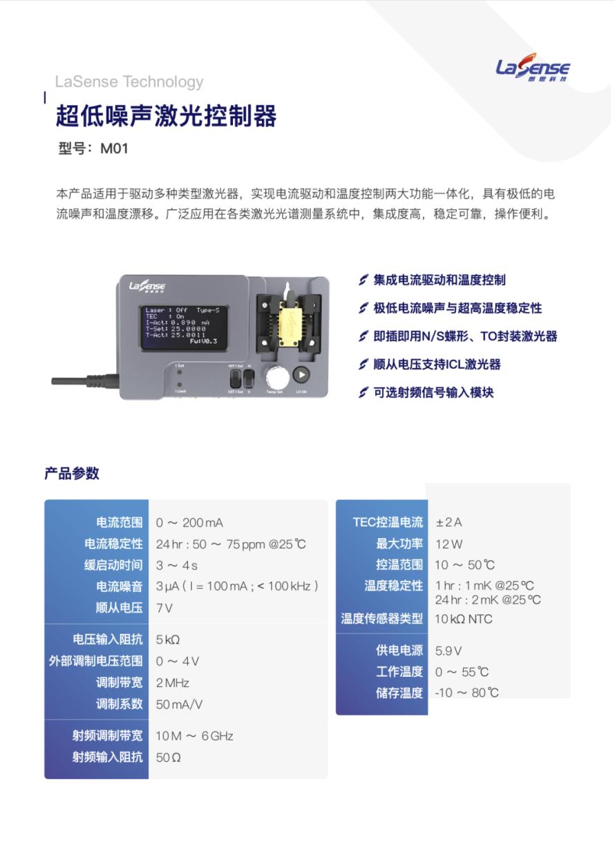 超低噪声激光控制器M01:精准调控激光器温度和注入电流,保证激光波长和功率的高稳定性。