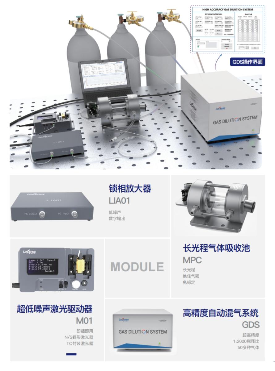 超低噪声激光控制器、1:2000自动混气系统、长光程气体吸收池、数字锁相放大器、光谱数据分析软件——该平台涵盖了TDLAS实验所需的全部核心组件,这套科研模组经过超过十年的精心设计、优化和迭代,是专业为应用TDLAS技术方法进行各类气体分析的科研工作者开发的最易上手、最高性能的实用工具,旨在让科学家们专注于实验的创新本身,免除复杂光电系统的搭建。