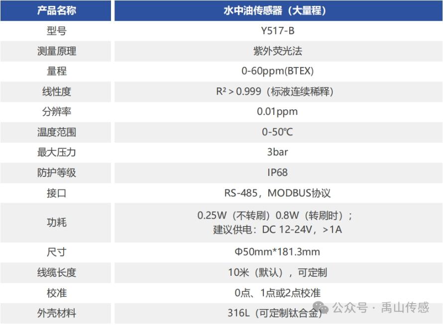传感器自带清洁刷,可消除气泡、油品,减少沾污对测量的干扰,使维护周期更长,长期在线使用也能保持极佳的稳定性。可对水中油的污染起到监测和预警作用。相较于禹山Y517-A水中油(多环芳烃)传感器,Y517-B量程范围更大,可实现高浓度环境应用。
