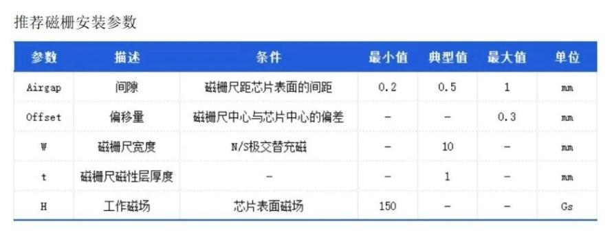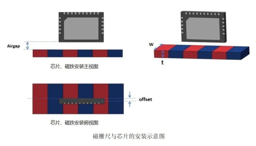 安装时,推荐磁栅尺中心与芯片中心对齐,芯片无焊盘的那一侧贴近磁栅尺放置,磁栅尺与芯片表面的间距应控制在一定的范围以内以保证测量的高精度;