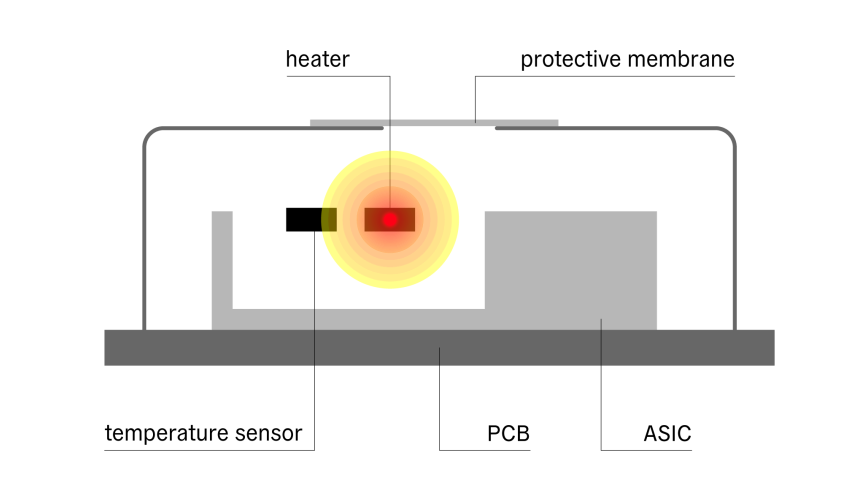 STCC4内部微型的MEMS加热器会对气体加热,不同气体的热导率差异显著,加热后的混合气体的热导率会随二氧化碳浓度变化而变化——通过测量热传导速率或温度变化,反推出二氧化碳浓度。得益于这一原理,STCC4无需传统的复杂光学结构,使得体积更为小巧、成本更低,也拥有较强的抗电磁干扰能力。