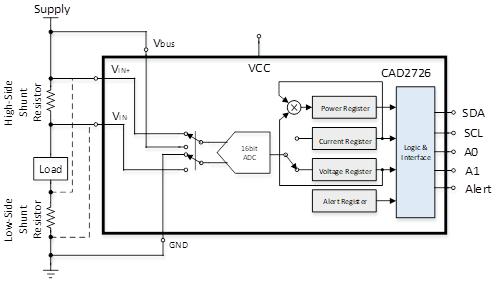 CAD2726 通过监测采样电阻的压降和总线电压,经过内部自带的乘法器,配合Calibration Register配置,自动计算得到流经负载的电流、电源总线功率数值。CAD2726 可监测0V-36V范围的电源电压,-81.9175mV to +81.92mV的采样电阻压降,支持高低侧测量模式。
