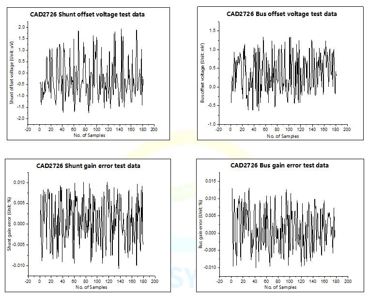 Shunt和Bus测量通道的失调电压VOS和增益误差Gain Error均有优秀表现,使得CAD2726有着很高的测量精确度。常温25℃下,随机测试176颗样品,数据如下:
