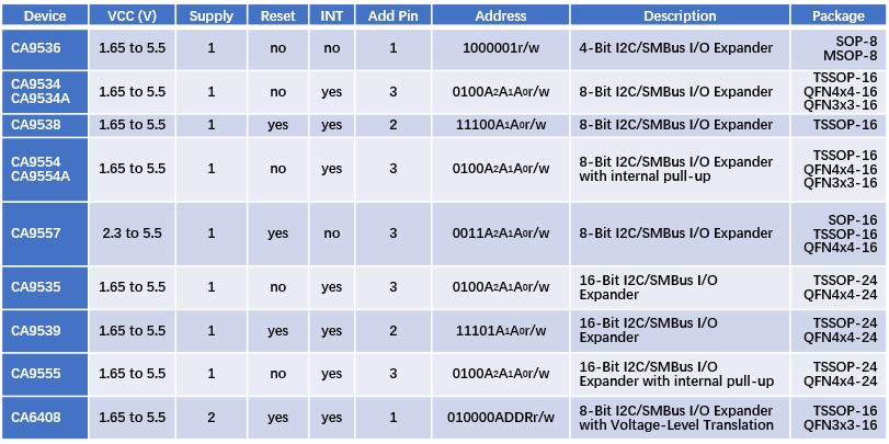 低待机电流 3.5uA(无内部上拉电阻产品可低至1uA,例如CA9535)