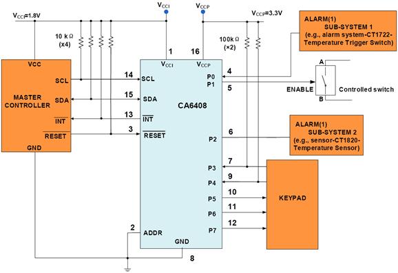图3 八通道I/O扩展芯片CA6408典型电路图(双电源供电)