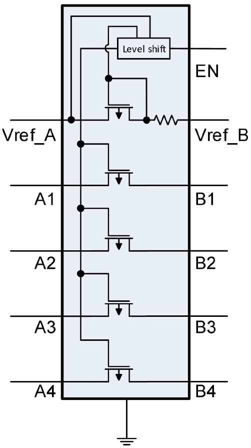 开关型电平转换器的工作原理是:当一端传来低电平时,传输门打开,两个端口导通,另一端被同步拉到低电平,以此完成低电平的传输;当一端为高电平时,传输门关闭,另一端被同侧的上拉电阻拉抬到相应电平上,从而实现高电平的转换。