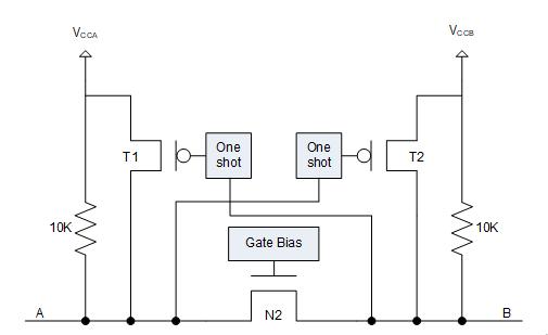 如图3所示,沿加速电路的工作原理为:当一端(例如端口A)传来高电平时,内部的沿加速电路(Oneshot)将快速打开另一端的MOS管(T2),由于MOS管内阻仅有几十欧姆,远小于常用的外部上拉电阻(通常为千欧姆级别),另一端端口(端口B)通过mos管得到电源(Vccb)的快速充电,被快速拉抬到相应的电平上(Vccb),此时Oneshot电路完成其使命后,随即关闭其控制的MOS管(T2),而另一端端口(端口B)的电平则被稳定保持在高电平(Vccb)上。由于有沿加速电路的加持,低电平到高电平的转换时间被大大缩短,通信速率由此得到提高。