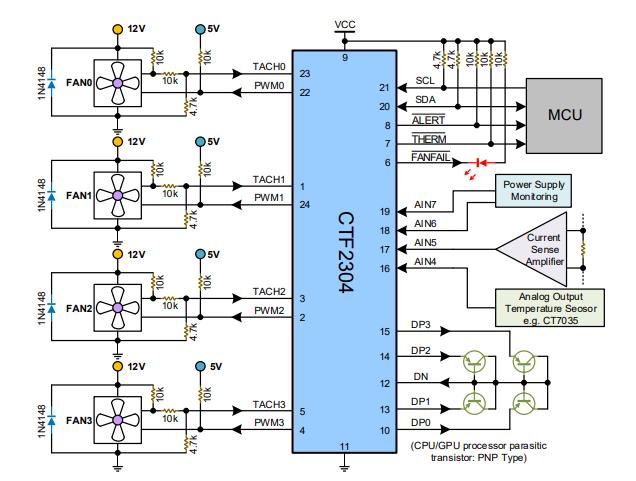 CTF230X热管理系列芯片CTF2301A/B、CTF2302以及CTF2304可提供不同通道的温度测量和风扇控制监测功能。