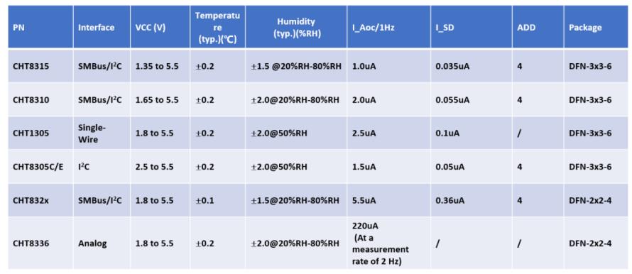 CHT8336是一款模拟输出温湿度传感器,湿度精度的典型值为±2.0%RH,温度精度典型值为±0.5℃。用户在使用时,无需重新校准,给芯片供电即可直接从不同的IO引脚读取温度和湿度输出电压。芯片电压工作范围为1.8~5.5V, 功耗低。
