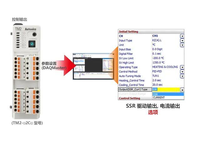 根据应用,用户可以通过DAQMaster参数设置功能在电流输出和SSR驱动输出之间进行选择。(TM2-□2C□ 型号)