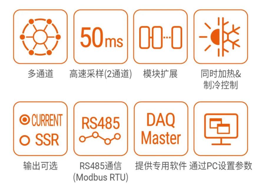 TM系列模块型PID温度控制器能够同时控制多达4个通道(TM4)或2个通道(TM2)。使用扩展连接器,TM系列可以轻松扩展以控制多达124/62个通道(TM4 / TM2),无需额外的电源或通信接线。温度控制器具有高速采样周期(TM4:100 ms / TM2:50 ms),RS485通信支持以及同步加热和制冷控制。附带的DAQMaster软件可轻松通过PC进行参数配置和状态监控。