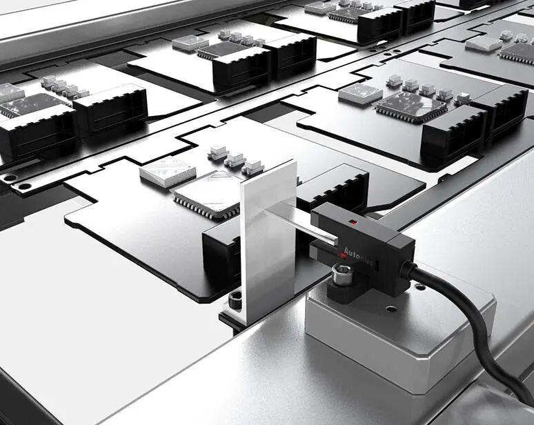 微型光电传感器用于检测PCB装载机上运输托盘的位置。