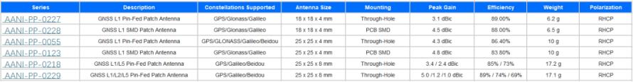 本次新品发布(NPI)推出了五款新型天线,它们具备多频段支持、紧凑轻巧的设计以及灵活多样的安装方式。其中,AANI-PP-0227采用穿孔安装设计,而AANI-PP-0228则支持表面贴装(SMD)技术,两款天线均拥有18×18毫米的紧凑尺寸,峰值增益分别达到3.1 dBic和4.5 dBic。AANI-PP-0123同样采用表面贴装设计,在25×25毫米的封装内实现了4.8 dBic的峰值增益,性能更为出色。为满足高级定位需求,AANI-PP-0218和AANI-PP-0229支持L1/L5和L1/L2/L5应用的多频段全球导航卫星系统(GNSS),增益最高可达5.0 dBic。这些新品的加入,为工程师提供了更大的灵活性,使其能够针对各种系统需求优化设计。