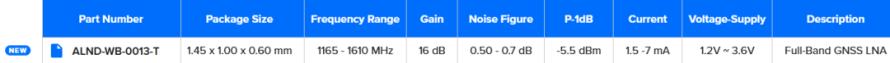 ALND-WB-0013兼顾灵活性与高效能,提供多种工作模式以满足不同应用需求。低功耗模式下,其电流消耗可低至1.5mA,其1.2V - 3.6V的宽工作电压范围使其能适配多种系统架构,而集成的1kV HBM静电防护 (ESD) 功能,则确保其在严苛工作环境下仍具备稳定的可靠性。该放大器基于先进的GaAs E/D-pHEMT工艺制造,仅需简单的匹配网络,为GNSS前端设计提供了易于集成的解决方案。