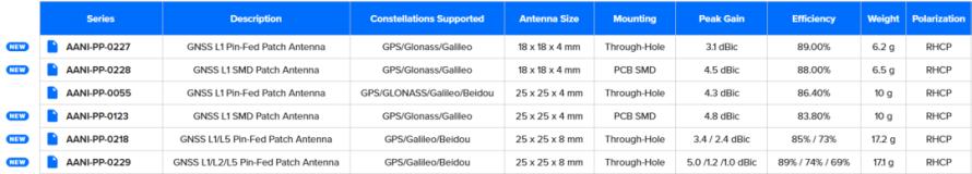 本次新产品发布推出五款新型天线,均支持多频段、采用紧凑型轻量化设计,并提供灵活的安装方式。其中,AANI-PP-0227 系列采用通孔式设计,AANI-PP-0228 系列支持表面贴装(SMD),两款天线均为18×18mm的紧凑型尺寸,峰值增益分别为3.1dBic和4.5dBic。AANI-PP-0123 系列同样支持表面贴装,在25×25mm的尺寸范围内实现了4.8dBic的峰值增益,性能进一步提升。针对更高精度的定位需求,AANI-PP-0218 系列和 AANI-PP-0229 系列支持多频段GNSS,适用于L1/L5及L1/L2/L5应用场景,增益最高可达5.0dBic。这些新增型号为工程师提供了更高的设计灵活性,能够满足各类系统的多样化需求,实现设计优化。