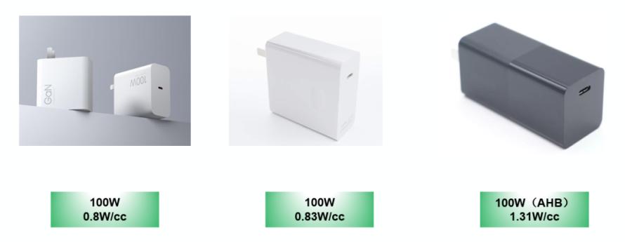 而不同应用场景的功率密度要求也不一样,比如 1.2W/cm³ 在 100W 手提电脑应用中是比较难实现的目标,而 1.5W/cm³ 在 100W 手机充电器中比较容易实现,最主要的原因是满载功率工作时间不一样。