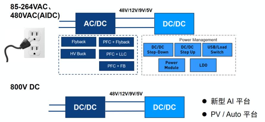ACDC 开关电源的技术创新持续突破,最新的 800V AI 电源架构重新定义了 AI 供电电源系统,而超高功率密度“饼干式”手机充电器(>1.3W/cm³)、“零功耗”手机充电器(<5mW)等产品也体现了消费市场的需求变化。