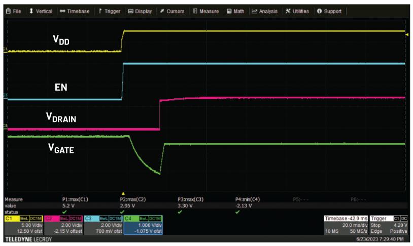图4.开启时的电源时序波形。一旦施加VDD,EN变为高电平就表示控制环路启动。首先开启VGATE,然后开启VDRAIN。