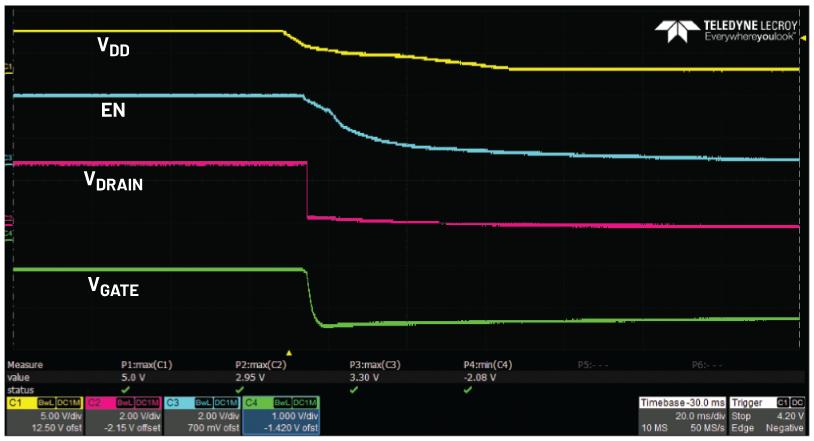 图5.关断时的电源时序波形。当VDD被移除时,EN变为低电平。VGATE将再次降至最小电压VNEG,VDRAIN将降至零。然后,VGATE最终将达到零。