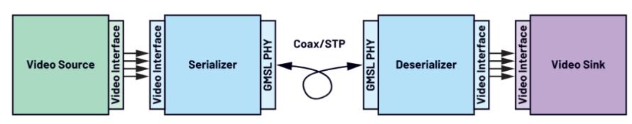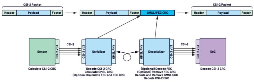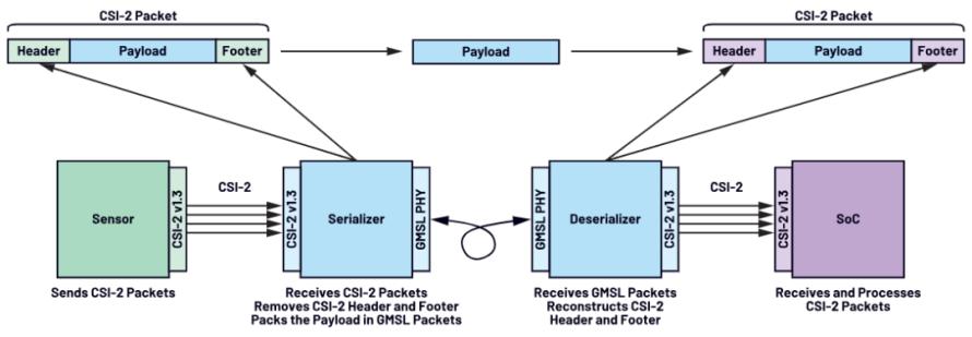 在GMSL系统中,CSI-2数据包由串行器接收,将其编码为GMSL数据包格式,再通过电缆传送到配对的解串器,由解串器将视频解包,并将CSI-2信息发送到本地处理器。