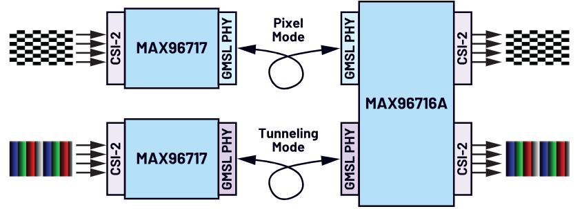 随着GMSL CSI-2器件的演进,出现了两种不同的视频数据传输模式。虽然两种模式都能确保视频内容通过GMSL链路安全可靠地传输,但其各自的特点也应予以考虑。两种传输模式分别是像素模式和隧道模式。