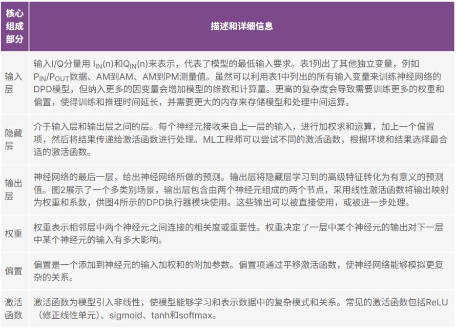 模型训练过程包括将表1中收集的(部分或全部)信号输入到系统中,并通过损失函数来优化DPD模型以使误差最小化。神经网络架构由相互连接的节点层(例如人工神经元)组成,即图3所示的组成部分。