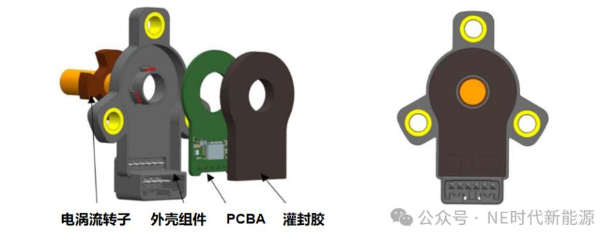 其核心部件是由电涡流转子(金属目标轮)、印刷电路板组件(PCBA)、外壳组件、灌封胶和电涡流控制模块组成。
