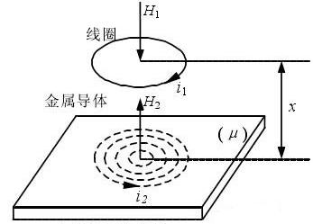 当线圈中通过高频电流i时,线圈周围产生高频磁场,该磁场作用于金属体,但由于趋肤效应,不能透过具有一定厚度的金属体,而仅作用于金属表面的薄层内。在交变磁场的作用下金属表面产生了感应电流Ie,即为涡流。感应电流也产生一个交变磁场并反作用于线圈上,其方向与线圈原磁场方向相反。这两个磁场相互叠加,就改变了原来线圈的阻抗Z,Z的变化仅与金属导体的电阻率ρ、导磁率u、激励电磁强度i、频率f、线圈的几何形状r以及线圈与金属导体之间的距离有关。线圈的阻抗可以用如下的函数式表示:Z=F(ρ、u、i、f、d)。当被测对象的材料一定时,ρ、u为常数,仪表中的i、f、d也为定值,于是Z就成为距离d的单值函数。