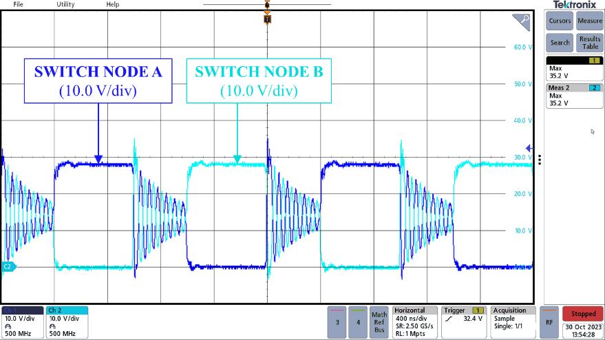 当死区时间内没有初级侧 FET 处于导通状态时,次级电流将继续通过同步整流器续流。此时,存储在初级侧的泄漏能量与初级侧 FET 的输出电容谐振,从而在 OUTA 或 OUTB 变为低电平时产生较大的泄漏尖峰。这种谐振会影响初级侧上的全部四个 FET。图 3 显示了泄漏尖峰可以达到多大。在实际应用中,较大的泄漏尖峰可能导致需要使用耐受更高电压的元件。