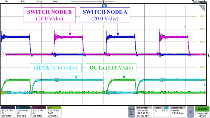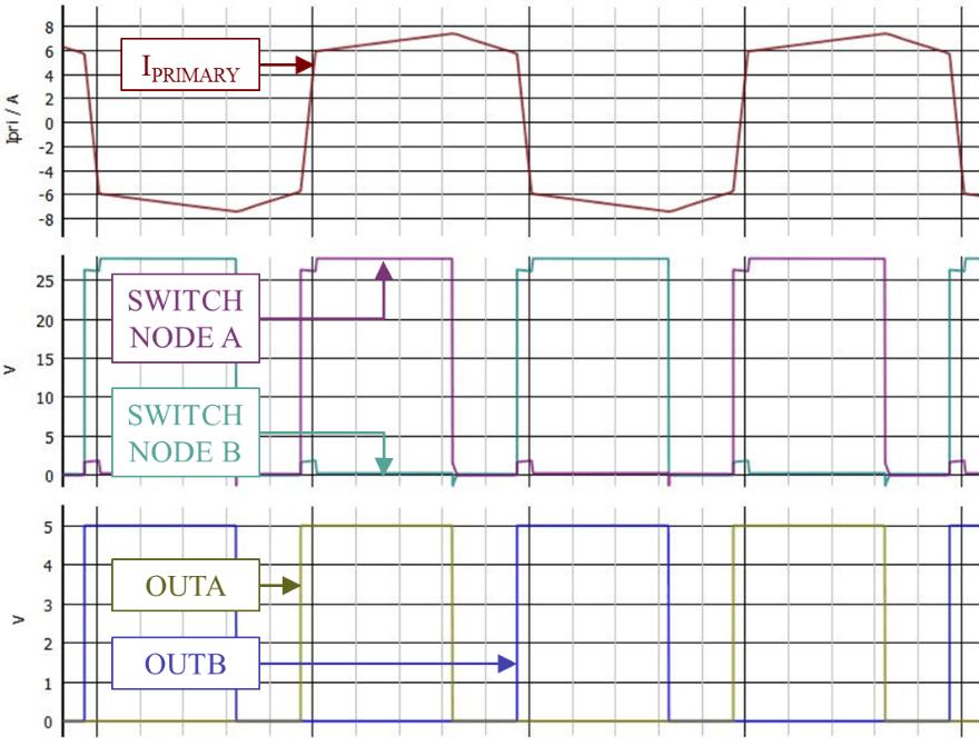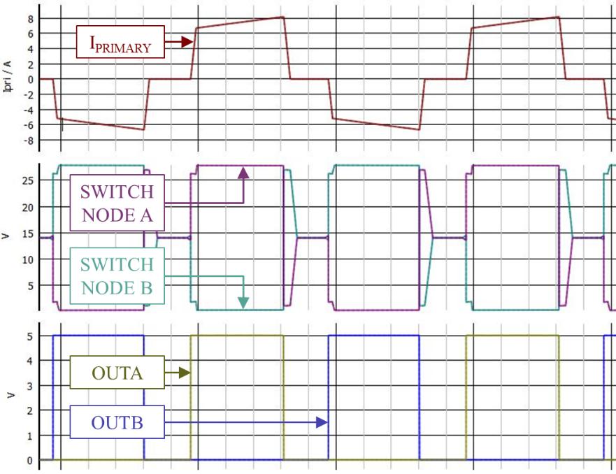 图 2(从上到下)显示了 OUTA 和 OUTB 信号,初级侧电桥每一侧的开关节点电压和初级侧绕组电流。在死区时间(OUTA 和 OUTB 均为低电平时)内,开关节点电压会回落到输入电压的一半。