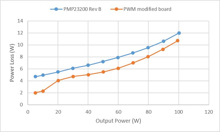 图 8. 传统方案(TI HSFB 参考设计 B 版)与 PWM(修改后的电路板)配置在不同输出功率下的总功率损耗对比