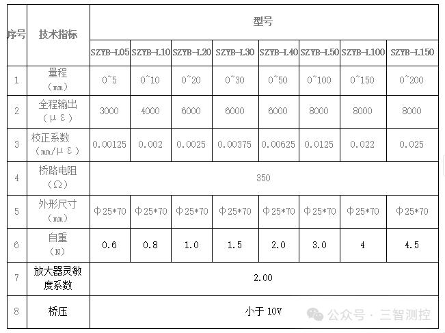 (3)电阻式位移计输出模拟电压信号,适应静态和动态的测量,适⽤电阻应变仪,以及以电阻桥信号输入的控制器。应⽤于模型试验、桥梁和轨道的振动及位移、以及混凝⼟和钢材等结构裂缝的监测。技术参考表: