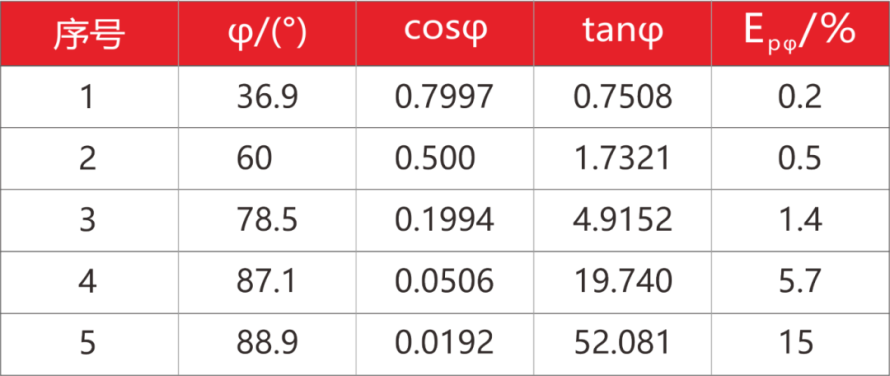 下表列出了电压、电流相位角在0°~90°范围内变化时,10'(相当于0.2级测量用电压、电流互感器的角差限值)角差引起的功率测量误差(Epφ)。