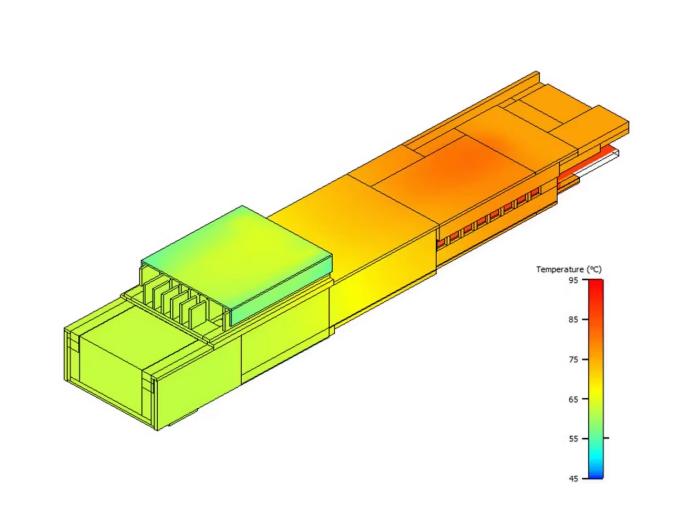 组件级模拟对于光学 I/O 模块也很重要,因为它可以识别模块主体上的热点。模拟需要考虑模块本身的内部结构,其次是与孤立模块的测量结果的相关性。单独运行温度测试时,需进行接触测量和红外摄像机测量。了解了收发器中的热特性后,就可以将它用作系统级模拟的输入信息,然后进行系统级测试和关联。