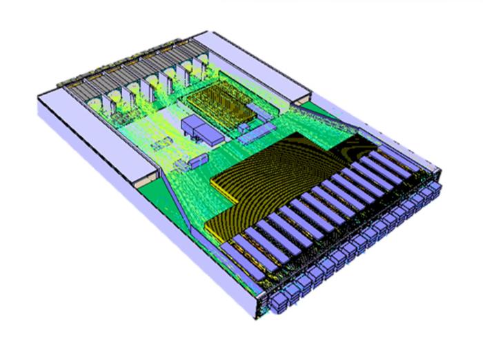 模拟/预测工程用于优化系统设计、组件放置和冷却策略,再进行构建和部署。在完成机械设计之前,优化光模块上的散热片和强制风冷方法通常需要模拟整个机箱内的气流。机架安装服务器在高度和宽度方面是标准化的,大多数部署采用 1RU 外形尺寸。其他组件(例如芯片、附加卡、SSD 等)的放置会影响流经机箱和一排 I/O 模块的气流路径,从而影响冷却效果。
