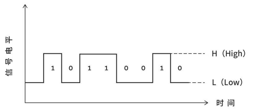 在图2的信号中,数据按照从先到后的顺序传输“01001101”。此外,信号电平是电压或电流,高(H)对应“1”,低(L)对应“0”。此外,这种波形称为矩形波或方波。