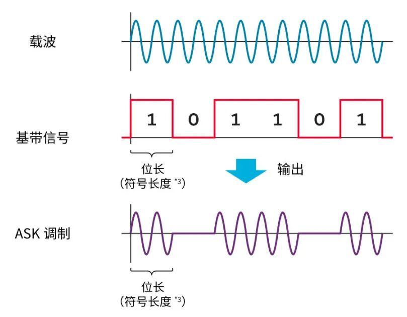 数字调制中的基本方式是ASK(Amplitude Shift Keying:振幅偏移)。如图4所示,通过改变载波的振幅来表示“0”和“1”。产生与基带信号一样——载波的高振幅(电压)表示“1”,低振幅表示“0”的调制波,并且振幅以与基带信号1位的时间长度(位长)相同的位长变化。