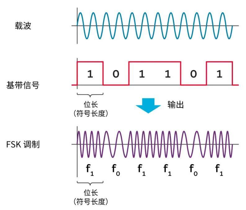 FSK(Frequency Shift Keying modulation),即频率偏移调制:该调制在基带信号为“1”时输出高频,在基带信号为“0”时输出低频。