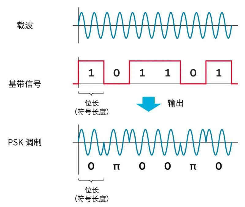 PSK(Phase Shift Keying modulation),即相位偏移调制:该调制在基带信号为“1”时输出相位差为0°的载波,在基带信号为“0”时输出相位差为180°的载波。